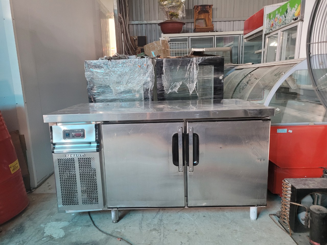 Bàn mát 1.5M Berjaya , mới 88%, tiện dụng 2 cánh mở ra , quạt gió , bên trong chứa thực phẩm, phía trên mặt bàn dùng làm bàn sơ chế, bàn ra đồ, pha chế đồ uống, bảo quản thực phẩm .
