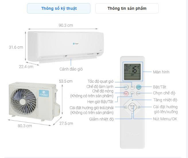 - Phạm vi làm lạnh hiệu quả: Từ 20 - 30m² (từ 60 đến 80m³)