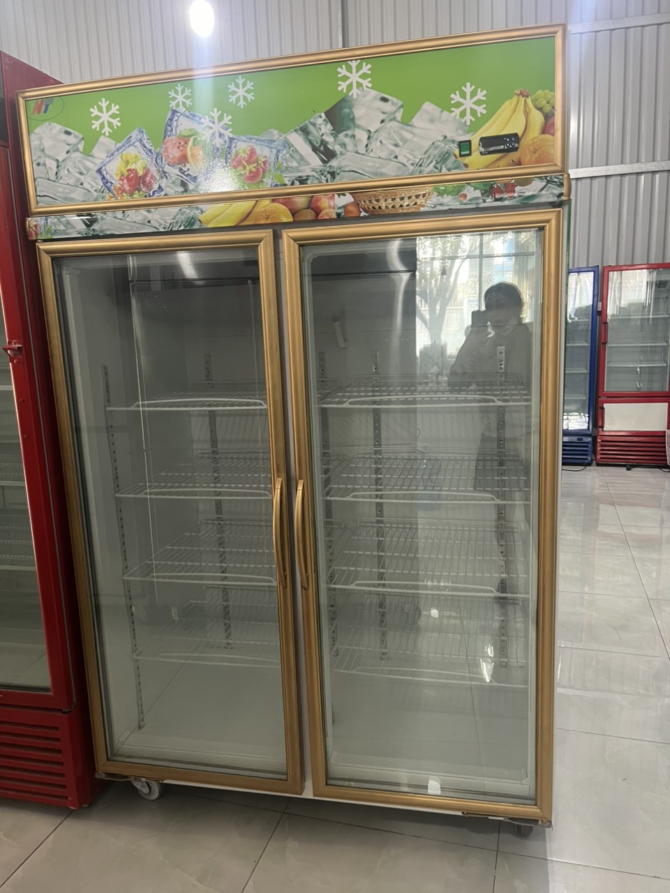 Tủ bánh kem Đài Loan 2 cánh 1000 lít, mới 88%, 4 khay tầng, mát lạnh nhanh, chạy êm, tiện dụng trưng bày nhiều loại bánh kem khác nhau.