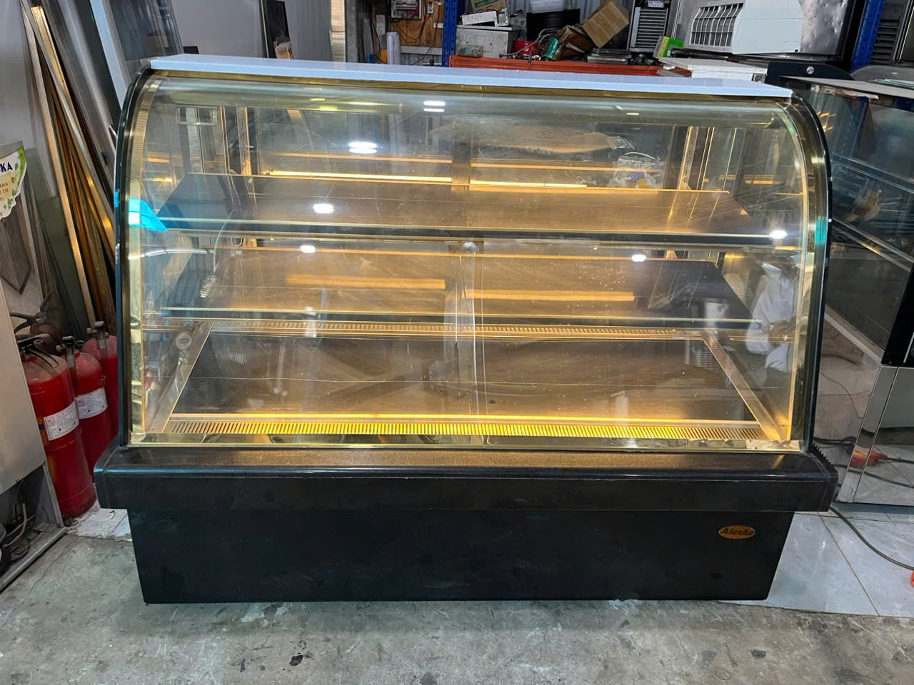 Tủ bánh kem kính cong Alaska 1,5m 3 tầng,  mới 80%, mát lạnh nhanh, chạy êm, tủ chuyên dụng giúp bánh kem tươi ngon lâu hơn.